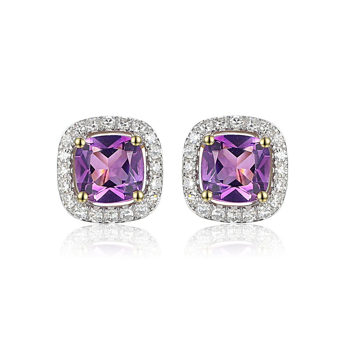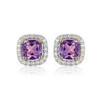 These exquisite 9ct gold earrings feature vibrant cushion-cut amethysts framed by a dazzling halo of diamonds.