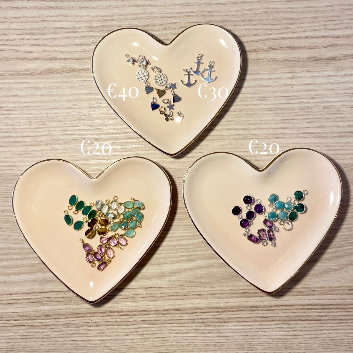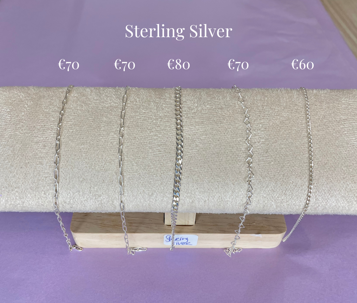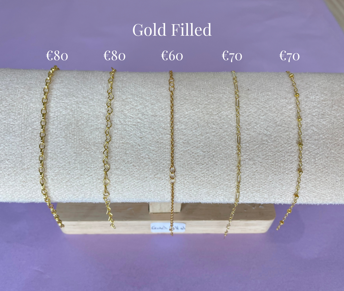 During your appointment you will be able to choose from a range of silver, 14 carat gold filled and 9ct gold chains - see photos. Silver chain starts at €50, gold filled starts at €50 and 9ct Gold starts at €120. There will also be charms available to add to your bracelet to allow you to personalise your piece. Charms cost €30-€60.